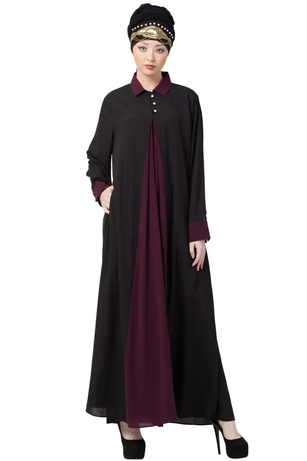 Black & Wine Contrast Yoke Black/White Casual Abaya
