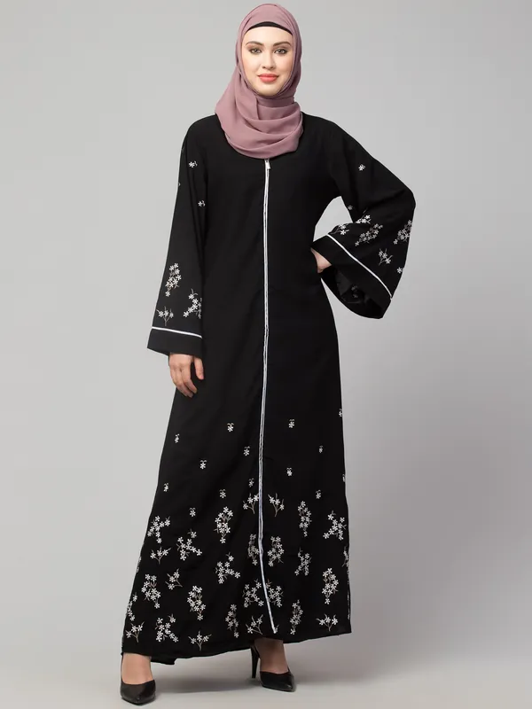Black Front Open Front & Back Sleeve Embroidered Abaya Cum Kaftan