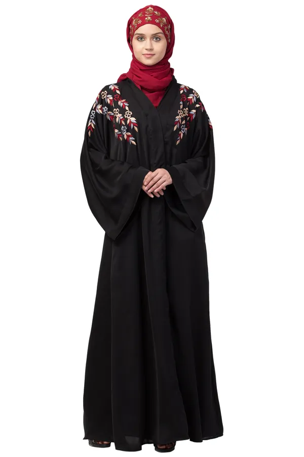 Black Resham Embroidery Front Open Dubai Abaya