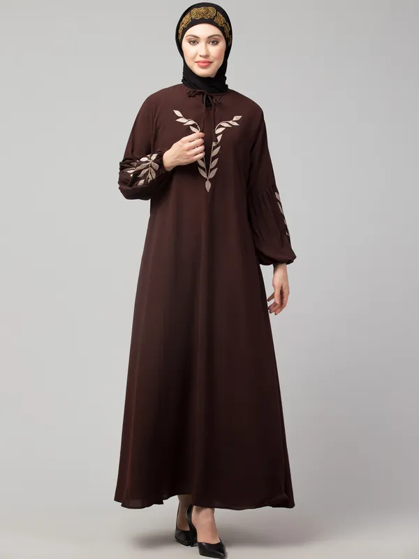 Brown Front And Sleeve Resham Embroidery Balloon Sleeve Abaya