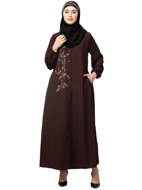 Brown Front Open Contrast Embroidery Casual Abaya