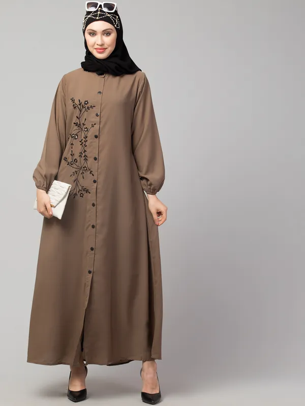 Khaki Front Open Contrast Embroidery Casual Abaya