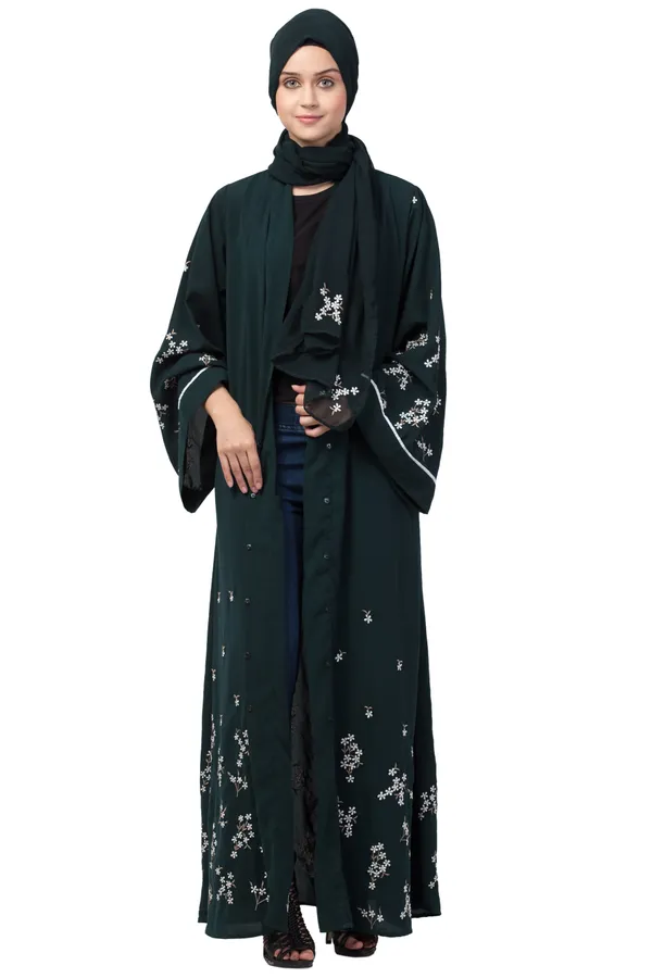 Multicolor Front Open Front & Back Sleeve Embroidered With Hijab Abaya Cum ..More