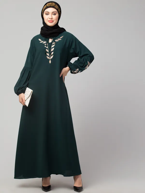 Rama Green Front And Sleeve Resham Embroidery Balloon Sleeve Abaya