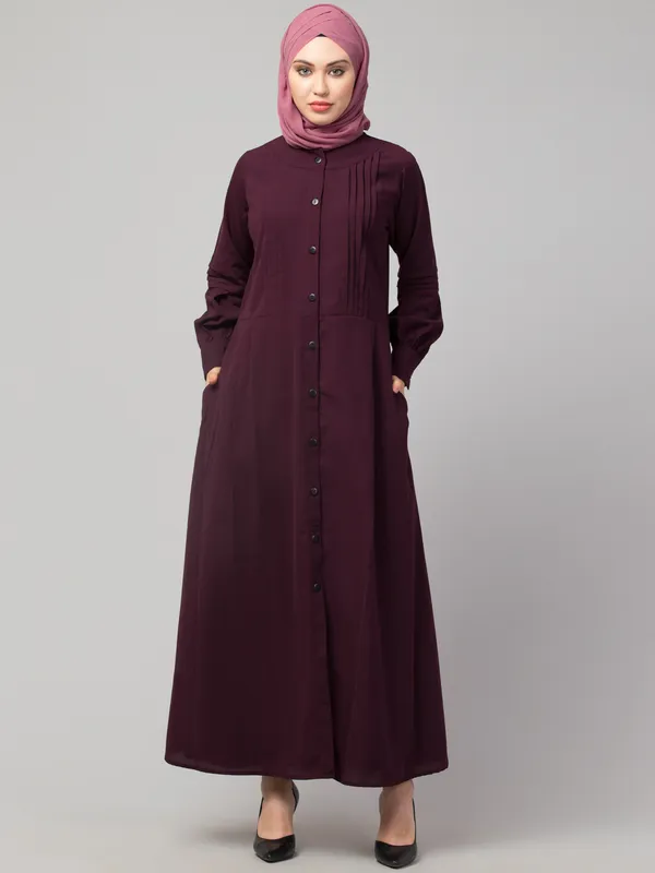 Wine Pleats At Front And Sleeve Front Open Casual Abaya